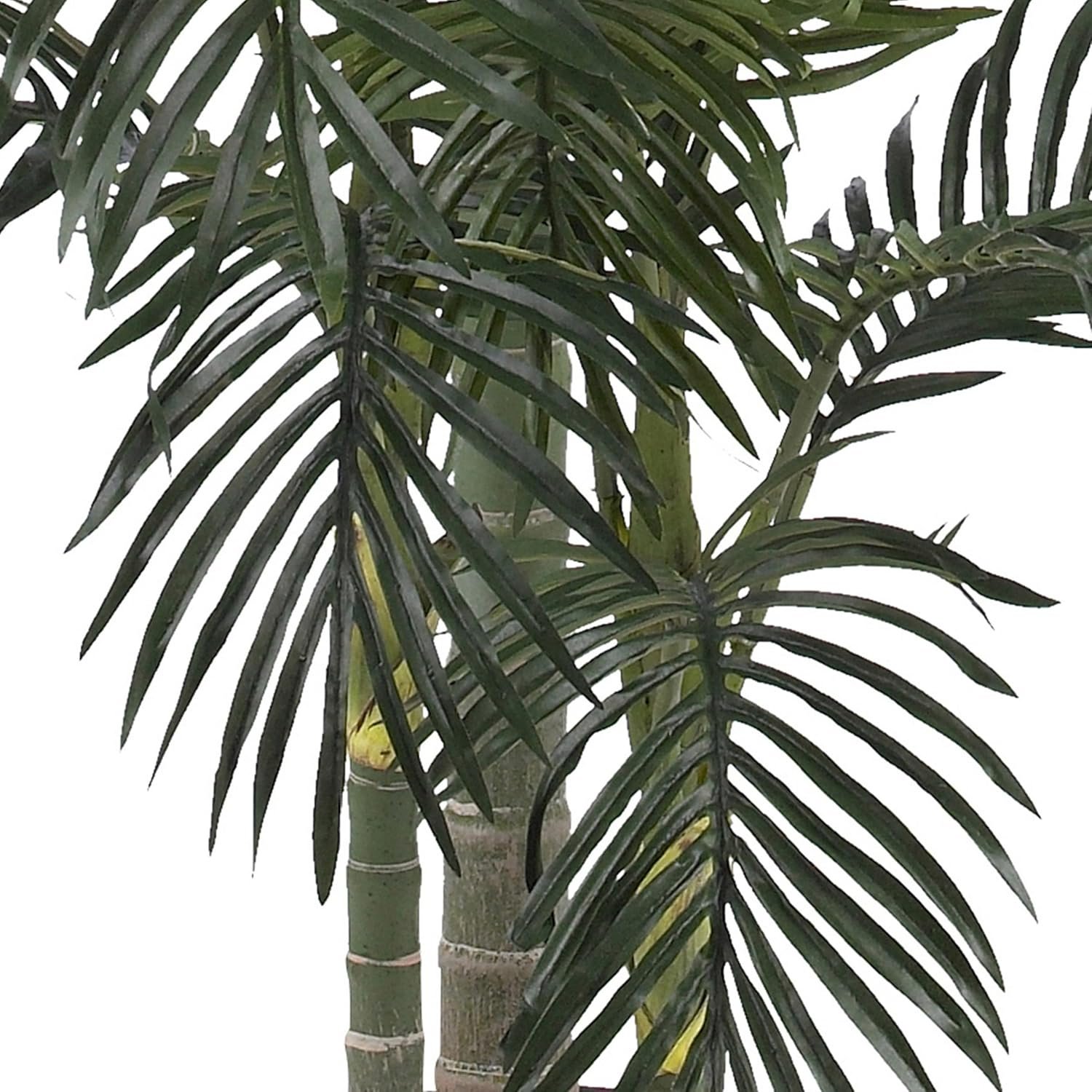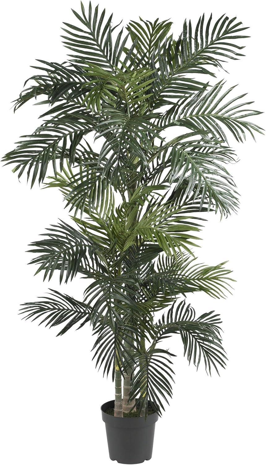 Bring effortless tropical elegance into your home with the Nearly Natural 6.5ft Artificial Golden Cane Palm Tree. This ultra-realistic silk palm features 333 lifelike fronds and three textured trunks, all designed exclusively for indoor use. Enjoy low-maintenance beauty year-round—no watering or sunlight needed—and easily shape the adjustable fronds to fit your space. Complete with a classic black nursery planter, it’s perfect for brightening up any room and instantly creating a relaxed, vacation-inspired vibe.