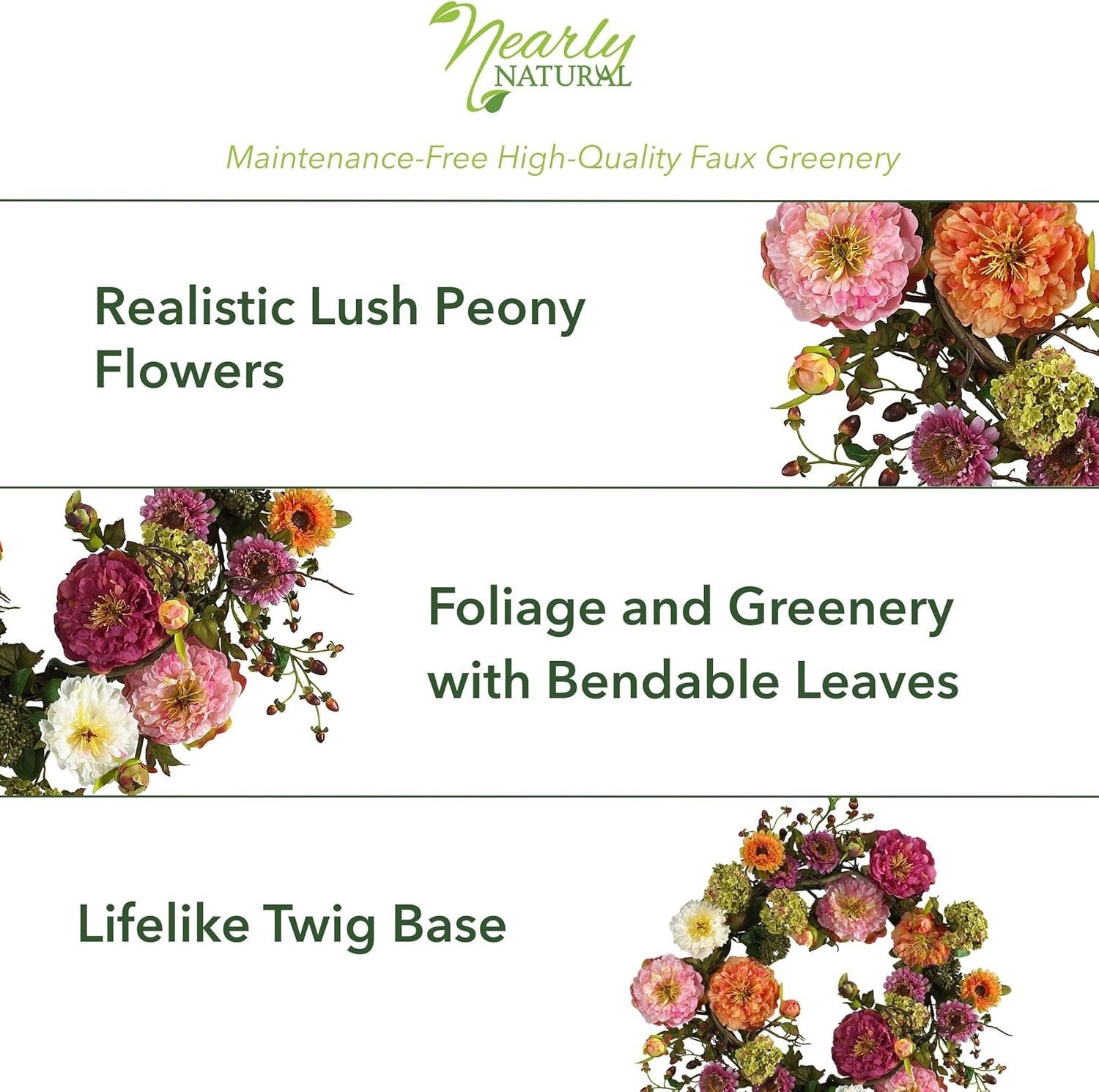 Compared to similar artificial wreaths like the Walmart 24″ Peony or the Peony/Hydrangea formulation from Nearly Natural, this product offers more color variety and a fuller appearance.